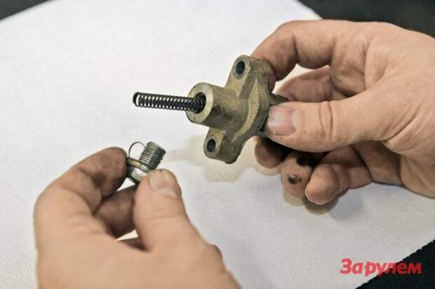 Уже лет двадцать пять, как натяжители перестали требовать регулировки. Хотя на раритетных моделях еще можно встретить механические натяжители (см. фото). Та конструкция требовала ослабить стяжной болт, провернуть немного коленчатый вал в сторону вращения мотора (до ослабления сопротивления) и опять затянуть болт. Просто и эффективно. Но в восьмидесятые появились системы, автоматически подтягивающие цепь по мере ее растяжения. Они применяются и сейчас. Используются разные технические решения, но суть у них общая: однажды выдвинувшись на некоторое расстояние, шток натяжителя фиксируется и обратно уйти уже не может. Таким образом, цепь все время остается натянутой, а усилие натяжения (поджатия) задается пружиной натяжителя.