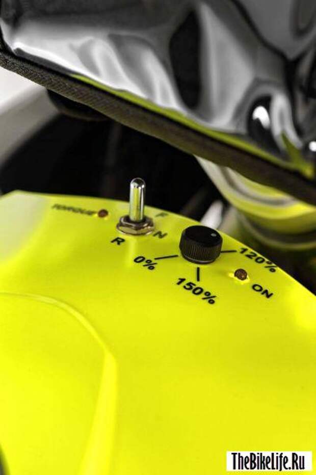 Мощности мотора, установленного на переднем колесе, вполне достаточно для разгона практически до 20 км/ч. Кроме того, этот двигатель позволяет использовать заднюю передачу, что не очень-то бесполезно, если вам понадобится припарковать вашего почти 300-киллограмового коня где-то на наклонной поверхности.