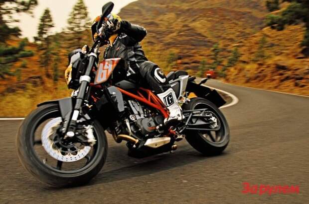 Заберите у меня этот «заводной апельсин»! Ну никак не получается ездить спокойно и по правилам! Даже в добропорядочной и утыканной камерами Европе. Даже здесь, на испанском острове Гран Канария, куда пригласили австрийцы. Транспортная артерия, ведущая вглубь острова, представляет собой относительно медленную, очень извилистую горную трассу с миллионом поворотов, шириной в полторы полосы, где выход из-за скалы в лоб встречной машине вполне обычное явление. Под напористый рокот «одностволки» на полном дросселе и под характерный стрекот «слиппер-клатча» на сбросе пары передач перехватывает дыхание от восторга. Короткий снос заднего колеса, наклон – и легкий мотоцикл без промедления прорезает дугу, через мгновение оказываясь у следующего поворота, чтобы повторить все снова и снова. Асфальт местами, особенно в середине острова, далек от зеркального, но Duke с намеченного пути не сбивается и идет ровно по траектории, без рысканий и раскачек. А коли уж заднее колесо сорвалось, то с помощью широкого руля отловить его труда не составит.