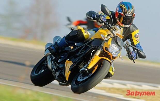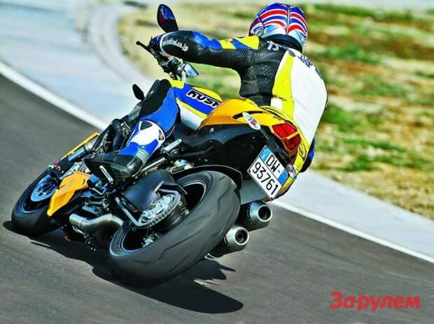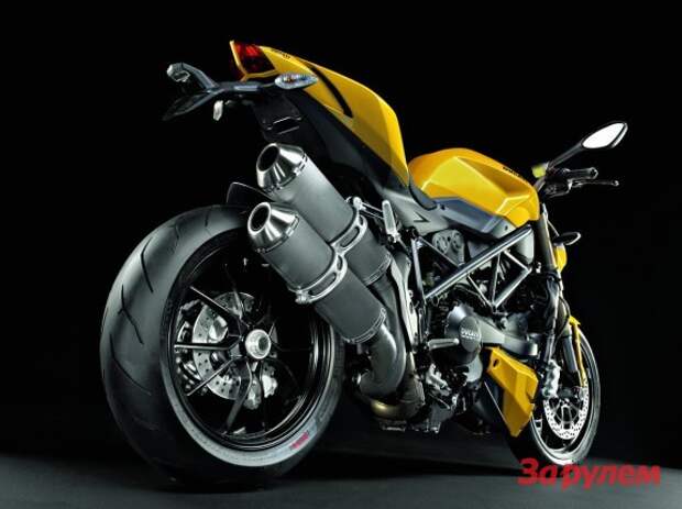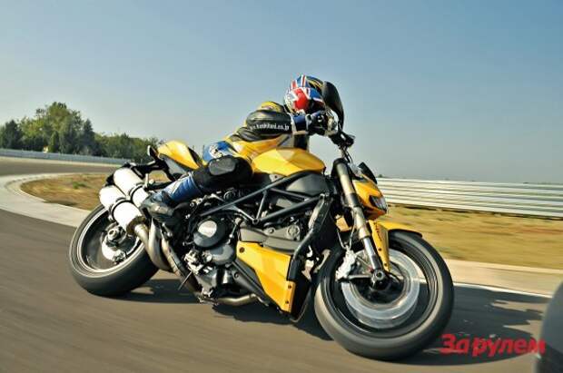 В выпускную систему мотоцикла встроен мощностной клапан с электронным управлением, призванный добавить тяги на малых и средних оборотах. Но при этом двигатель явно настроен на хорошую отдачу на высоких оборотах. Ну что же, ведь это стритфайтер, а не десмо-макси-скутер! На малых оборотах мотор просто спит, начиная просыпаться на 3500 об/мин, а полноценной отдачи вы дождетесь лишь после 5000 об/мин. Но уж отсюда и до 11 600 об/мин, когда срабатывает ограничитель (между прочим, это на 300 об/мин выше, чем у спортбайка 848EVO), вы наслаждаетесь линейным приростом мощности и великолепным саундом из двух глушителей.