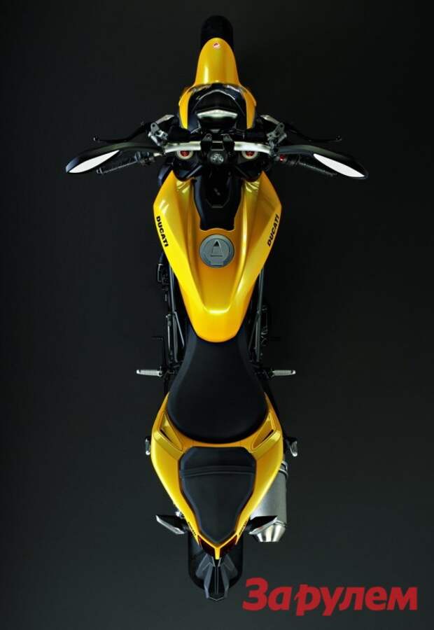 Когда садишься в довольно высокое – 840 мм – седло, сразу отмечаешь, сколь радикальна поза пилота. Кажется, что твой подбородок парит прямо над осью переднего колеса! Инженеры ухитрились сделать 16,5-литровый бензобак очень коротким. В то же время алюминиевый руль из единой трубы переменного сечения сидит на 20 мм выше, чем у старшей версии, его рукоятки оттянуты назад, а подножки ощутимо смещены вперед, так что в целом посадка близка к вертикальной и довольно удобна.