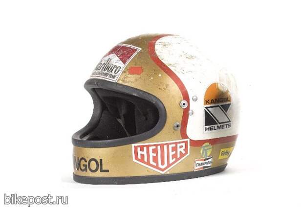 На фото показан шлем Kangol Falcon, которым в прошлом экипировался великий Майк Хэйлвуд во время финала гонок Турист Трофи 1979 года. Шлем является достоянием истории и недавно пополнил одну из частных коллекций.