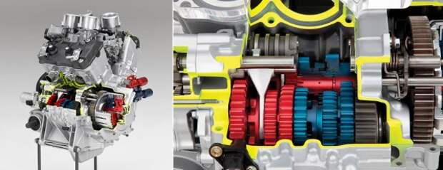 Принцип работы довольно прост. Шестерни четных передач сообщаются с двигателем посредствам одного пакета сцепления, а нечетные «висят» на втором. В момент, когда приходит время переключать передачу, например, с первой на вторую, первая, естественно, уже включена, сцепление замкнуто. При этом вторая передача тоже уже включена, но сцепление, на котором она «висит», — разомкнуто. В момент переключения первое сцепление размыкается, в то же мгновение включается второе. Весь процесс занимает 0,3 секунды. Пока мотор раскручивается, разгоняя мотоцикл до момента, когда нужно будет снова переключаться вверх, у автоматики будет достаточно времени, чтобы включить уже третью передачу, «висящую» на первом сцеплении. Если же электроника поймет, что пилот сбрасывает скорость, а не разгоняется, компьютер даст команду на подготовку к включению пониженной передачи.