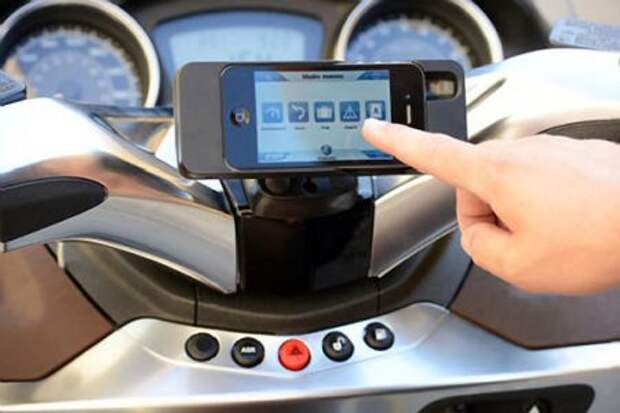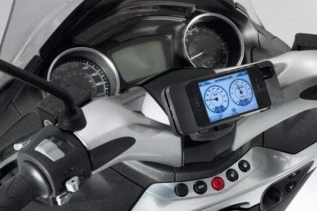 iPhone можно будет закрепить на руле, и он станет своего рода приборной панелью. Какие именно данные он будет отображать — выбираете вы сами. В списке опций — как привычные скорость, обороты двигателя и запас топлива, так и текущая мощность двигателя, текущий крутящий момент, ускорение, а также напряжение на клеммах аккумулятора. А если ваш скутер оборудован ABS и трэкшн-контролем, то система PMP сможет указать давление в покрышках и даже время, когда пора их «переобуть».