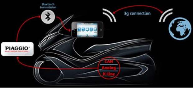Piaggio представил свою новинку в области высоких технологий — PMP (Piaggio Multimedia Platform). Это дополнительная опция, которую можно докупить для макси-скутеров серии X10 объёмом 125, 350 и 500 куб. см. После этого ваш скутер сможет передавать телеметрические данные на iPhone. Без проводов, само собой.