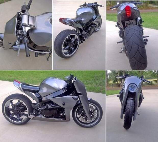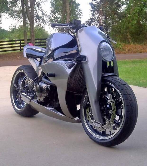 Односторонний маятник от VFR800 отлично подошел к 7,5-дюймовому в ширину и 18-дюймовому в диаметре диску от автомобиля Honda Civic. Передний колесный диск взяли от Honda RC51, а фары головного света — от Harley-Davidson V-Rod. Стопари перешли с Aprilia RSV1000R, передние тормоза и тормозной цилиндр — с Kawasaki ZX12. А вот обтекатели оригинальные, собственной придумки тюнинговщиков. И GPS-навигатор в роли спидометра.
